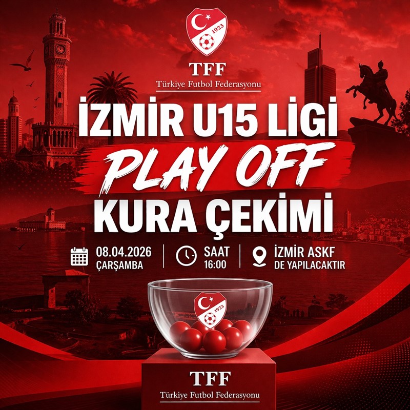 İZMİR İLİMİZDE GRUPLARINDA İLK 2 SIRADA OLARAK PLAY OF OYNAMAYA HAK KAZANAN TAKIMLARIMIZIN 08.04.2026 ÇARŞAMBA GÜNÜ SAAT 16:00 DA İZMİR ASKF TOPLANTI SALONUNDA YAPILACAK OLAN KURA ÇEKİMİNDE YER ALMALARI HUSUSUNDA GEREĞİNİ RİCA EDERİZ.